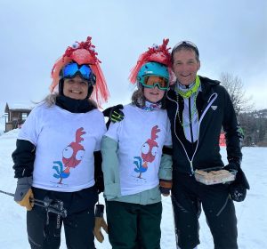 Three people are standing on the snow. Two are wearing the same costumes and one is hugging the youngest in the middle.