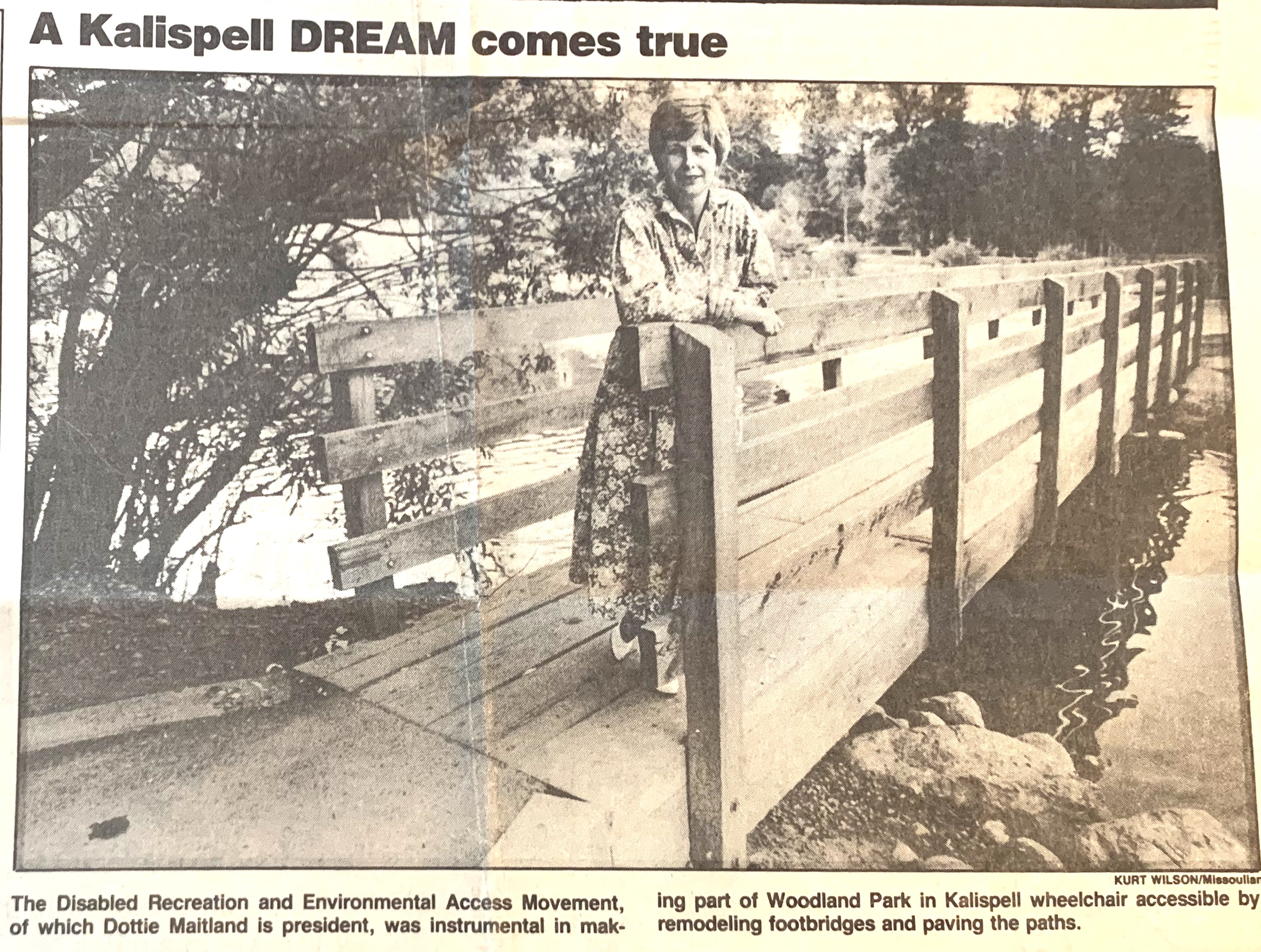 In 1985, a full five years before the Americans with Disabilities Act was enacted by Congress, a group of Flathead residents banded together to make outdoor activities more accessible to people with disabilities. Dottie Maitland was operating a tour company at the time and discovered the inaccessibility to hotels, public parks and recreational sites for the disabled. Joined by Jane Lopp and Larry Dominick, they traveled to Washington D.C. and met with the United States Access Board – a federal agency that promotes equality for people with disabilities. The information they gathered from the trip would shape the way the group would operate and define their mission to make public places in the Flathead accessible to people with disabilities. After the trip, Larry McMillian, who was in a wheelchair, joined the group along with Dennis Jones who had worked with the Big Mountain ski program.