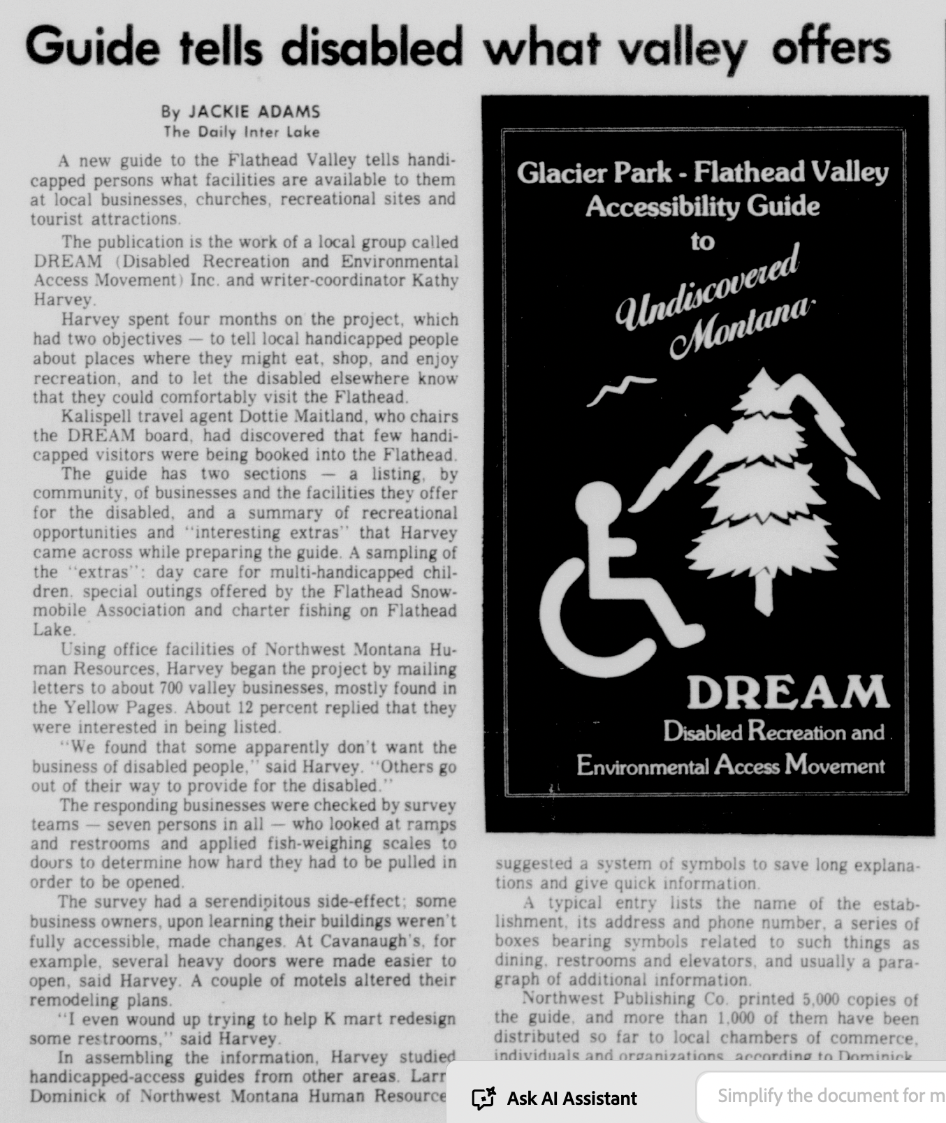 Other early projects included putting in a wheelchair accessible trail at Woodland Park in Kalispell, producing an accessibility guide for all tourism-related businesses in the state and providing demonstrations at large events of the meaning of living with physical disabilities.